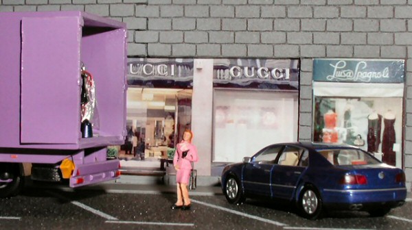 farblich veredelt. Die Fassade der Edelboutiquen besteht aus eigentlich dunkelbraunem Steinmauerprofil, das ich