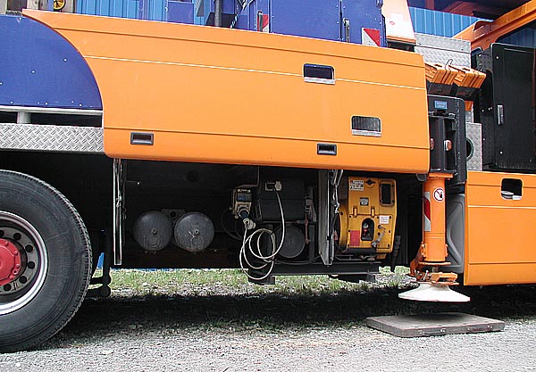 hinter der sich alle Aggregate des LKW und die Lagerungsmöglichkeiten für die Abstützhilfsmittel